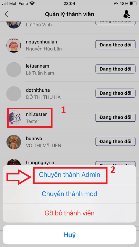 Chọn Chuyển thành Admin, Chuyển thành Mod, hoặc Gỡ bỏ thành viên.